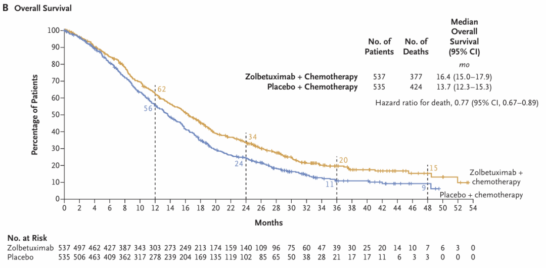 汇总研究结果显示,与安慰剂+化疗相比,佐妥昔单抗+化疗显著延长了无进展生存期,治疗组和安慰剂组的中位PFS分别为9.2个月和8.2个月,疾病进展风险降低了29%(HR=0.71;95% CI, 0.61-0.83),达到了主要终点。在关键次要终点方面,佐妥昔单抗联合化疗显著延长了OS,治疗组和安慰剂组的中位总生存期分别为16.4个月和13.7个月,死亡风险降低了23%(HR=0.77;95% CI,0.67-0.89),2年生存率治疗组是对照的2倍。接受佐妥昔单抗治疗的患者中最常见的不良事件是恶心和呕吐,此次汇总分析未观察到新的安全信号。
