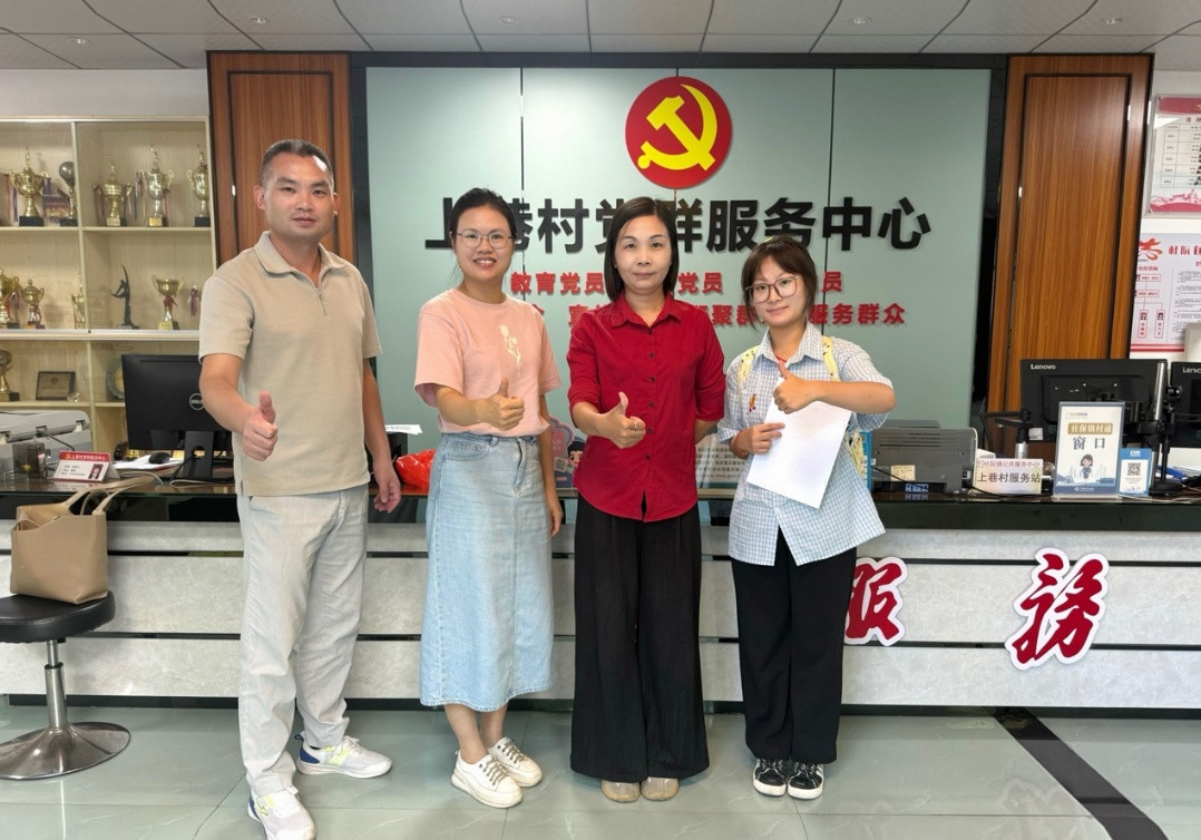 仲恺农业工程学院人文与社会科学学院张文浩、郭思源老师带领叶晨意等同学深入中山、梅州和湛江3个地市的行政村,了解乡村治理现状与发展需求。在梅州市蕉岭县蕉城镇龙安村与陂角村,叶晨意真切感受到了基层群众参与治理的热情。她回忆道:“村民们积极踊跃地配合问卷调研,围绕党建、治理等多个方面坦诚提出宝贵意见,现场氛围既热烈又融洽,令人印象深刻。”