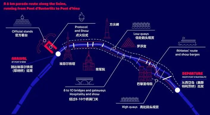2024年巴黎奥运会开幕式将从体育场“搬到”开放式的城市区域举办,以塞纳河为舞台,向全球展示巴黎的世界文化遗产与城市风貌。主舞台计划布局在西岱岛和埃菲尔铁塔之间长达6公里的塞纳河河道及沿河区域,打造一场壮观而创意的流动盛宴。