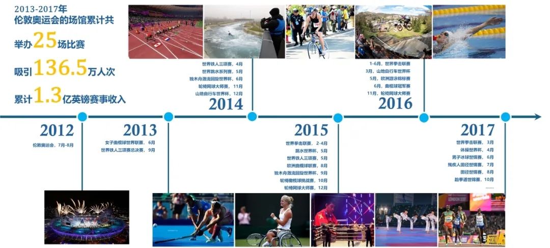 2013-2017年间,伦敦奥运会的场馆已累计共举办25场比赛,吸引136.5万人次,累计1.3亿英镑赛事收入,成为利用奥运遗产的全球典范。