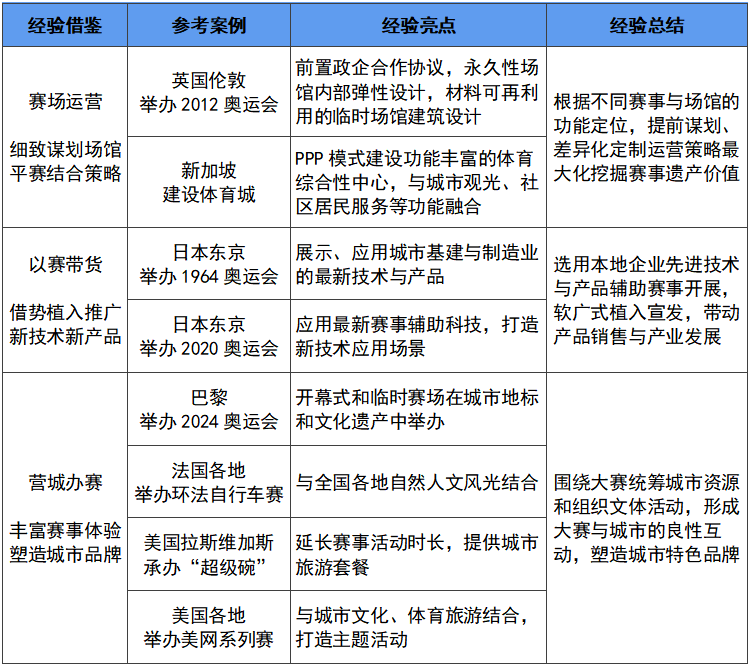 总结世界城市在场馆、产业、城市三个维度“以赛带城”的案例,我们得出以下三点主要经验: