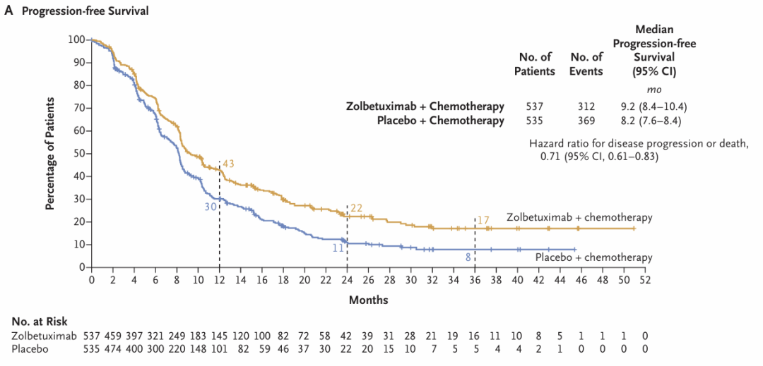 汇总研究结果显示,与安慰剂+化疗相比,佐妥昔单抗+化疗显著延长了无进展生存期,治疗组和安慰剂组的中位PFS分别为9.2个月和8.2个月,疾病进展风险降低了29%(HR=0.71;95% CI, 0.61-0.83),达到了主要终点。在关键次要终点方面,佐妥昔单抗联合化疗显著延长了OS,治疗组和安慰剂组的中位总生存期分别为16.4个月和13.7个月,死亡风险降低了23%(HR=0.77;95% CI,0.67-0.89),2年生存率治疗组是对照的2倍。接受佐妥昔单抗治疗的患者中最常见的不良事件是恶心和呕吐,此次汇总分析未观察到新的安全信号。