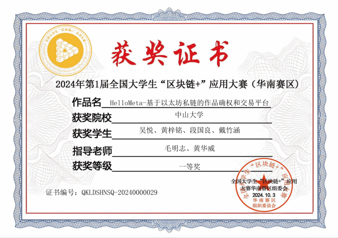 湾区时讯 在刚刚结束的2024年全国大学生“区块链+”应用大赛中,中山大学软件工程学院参赛选手本科生吴悦、黄梓铭、段国良、戴竹涵在毛明志、黄华威老师的指导下,凭借卓越的创新能力和扎实的实践技能,在全国众多高校队伍中脱颖而出,首先获得华南赛区五省初赛一等奖,最终荣获国赛一等奖。