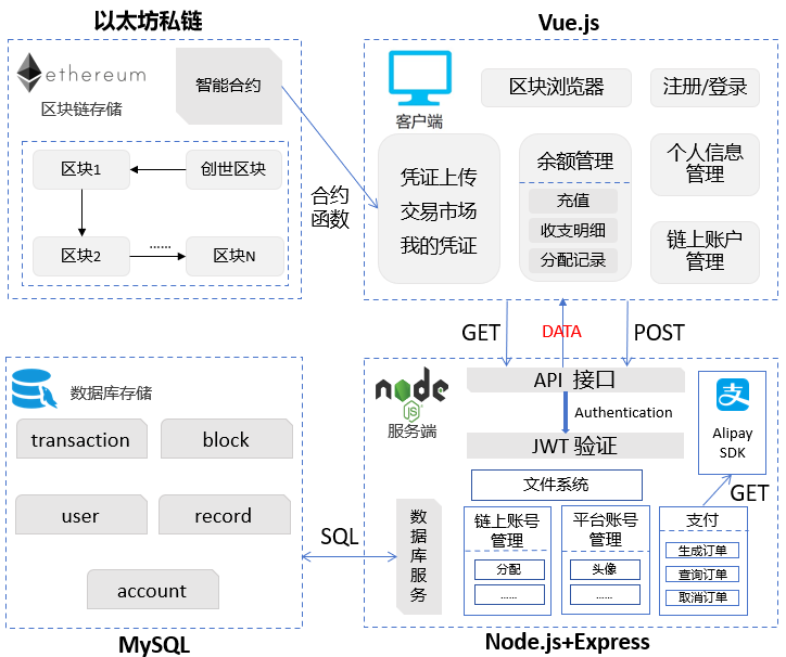 创新点:该项目采用Vue.js作为前端框架,Node.js与Express作为后端技术栈。系统利用以太坊私链来记录交易数据,并通过智能合约实现铸造和交易等功能。MySQL数据库则用于存储用户、账户等非链上信息。利用区块链去中心化、不可篡改的特性,企业可以根据自身需求,将数据转化为可交易的资产上传交易市场,也可以仅铸造权属凭证。此外,为方便用户查询铸造和交易记录,系统还提供了区块浏览器查询功能。