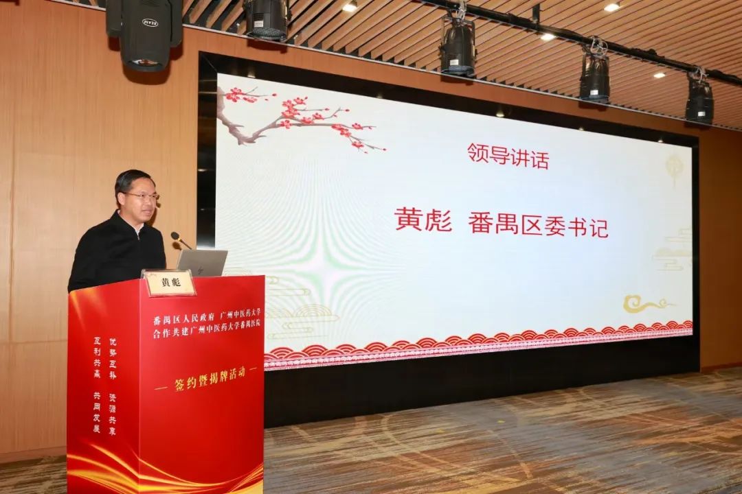 黄彪指出,共建广州中医药大学番禺医院是番禺区加快中医药强区建设,推动番禺中医药事业和产业实现高质量发展的重要举措,事关400多万番禺市民的健康福祉。番禺区历来重视医疗、卫生等公共服务发展,他期待双方此次合作,将番禺区中医院加快打造成为中医药事业发展的示范引领标杆,为全区人民提供多样化、高品质的中医医疗服务,全力打造粤港澳大湾区优质生活圈。同时希望广州中医药大学大力支持番禺区中医药发展,通过产教融合,强强联手,共同推动中医药大健康产业发展,助力健康番禺建设。