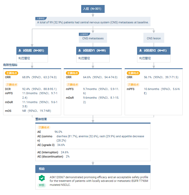 CNS 患者颅内 ORR 为 56.1%,CNS 患者 PFS 为 10.6 个月,这意表明 ASK120067 片对 CNS 患者具有较好的疗效。