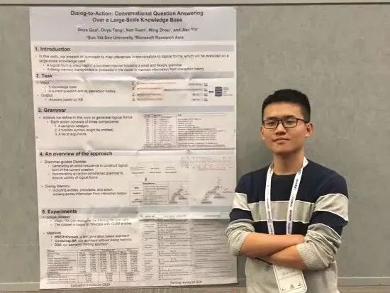 郭达雅,自2014年9月份开始就读于中山大学,本科阶段就读于中山大学数据科学与计算机学院计算机系,大四入选中山大学—微软亚洲研究院(简称MSRA)联合培养博士生项目,并在中山大学人工智能学院印鉴教授和MSRA周明博士的指导下取得博士学位,主要研究方向为NLP(自然语言处理)。在MSRA 实习期间,郭达雅便发表两篇 AI 顶会论文(EMNLP、NeurIPS),在博士阶段入学的第三天,就完成了中山大学博士毕业的论文发表要求。