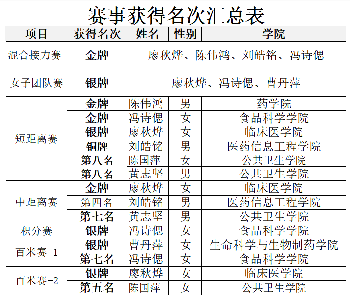 混合接力赛金牌、短距离赛金牌、积分赛银牌、女子团队赛银牌 食品科学学院 冯诗偲