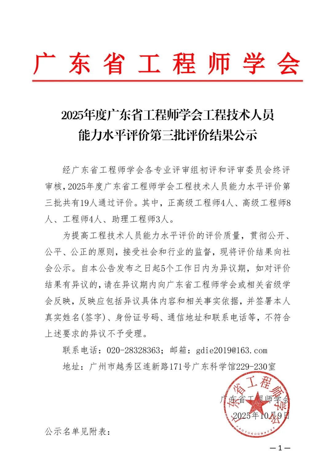 为提高工程技术人员能力水平评价的评价质量,贯彻公开、公平、公正的原则,接受社会和行业的监督,现将评价结果向社会公示。自本公告发布之日起5个工作日内为异议期,如对评价结果有异议的,请在异议期内向广东省工程师学会或相关省级学会反映,反映应包括异议具体内容和相关事实依据,并签署本人真实姓名(签字)、身份证号码、通信地址和联系电话等,不符合上述要求的异议不予受理。