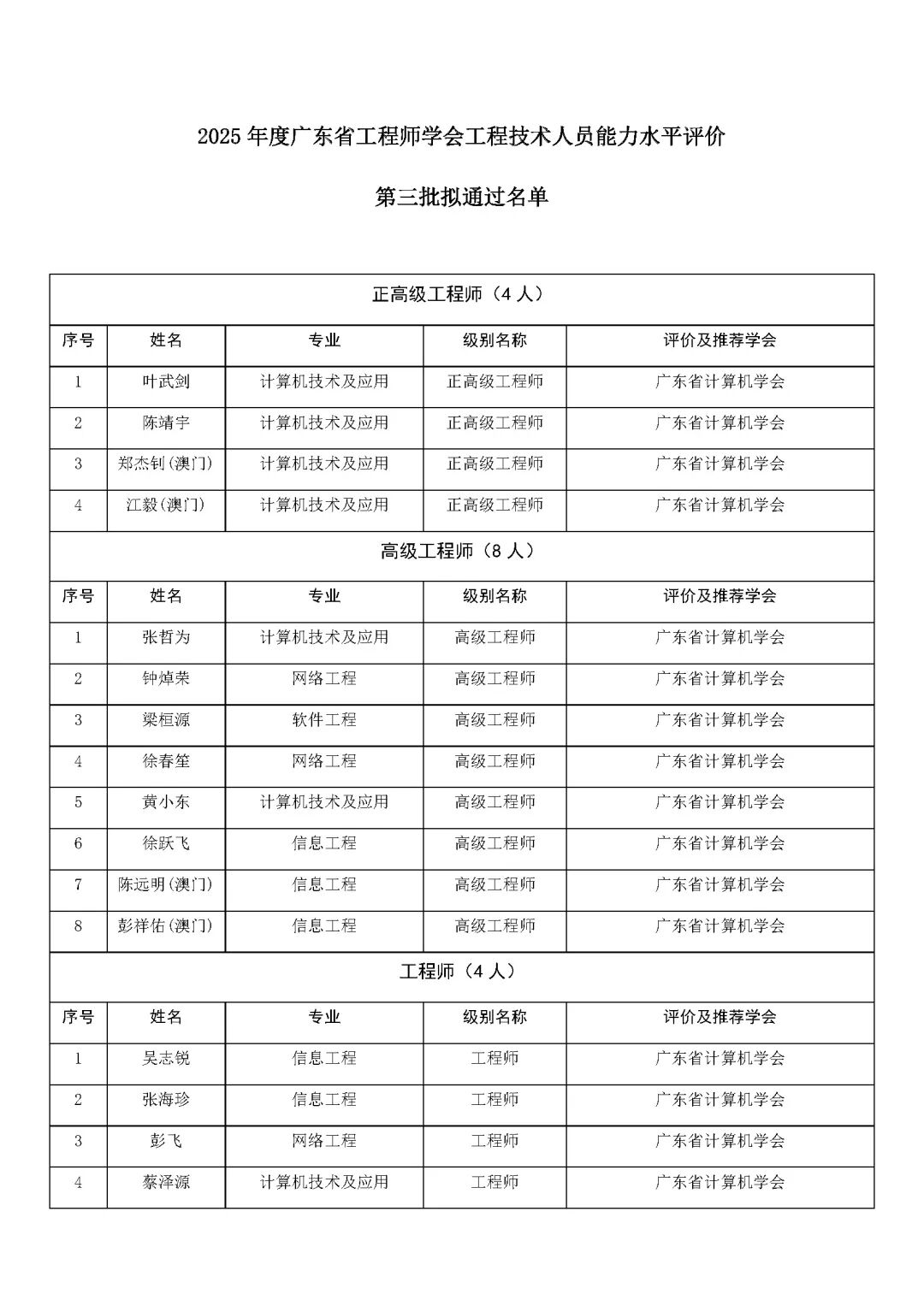 经广东省计算机学会、广东省工程师学会评审组初评和评审委员会终评审核,2025年度粤港澳大湾区粤澳计算机类专业技术人员水平评价(第八期)共有19人通过评价。其中,正高级工程师4人、高级工程师8人、工程师4人、助理工程师3人。
