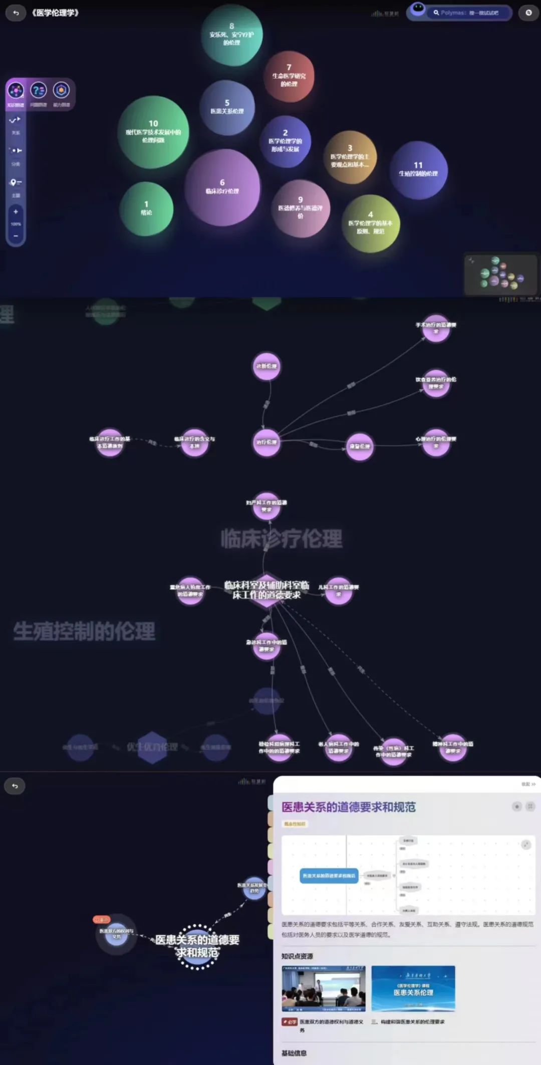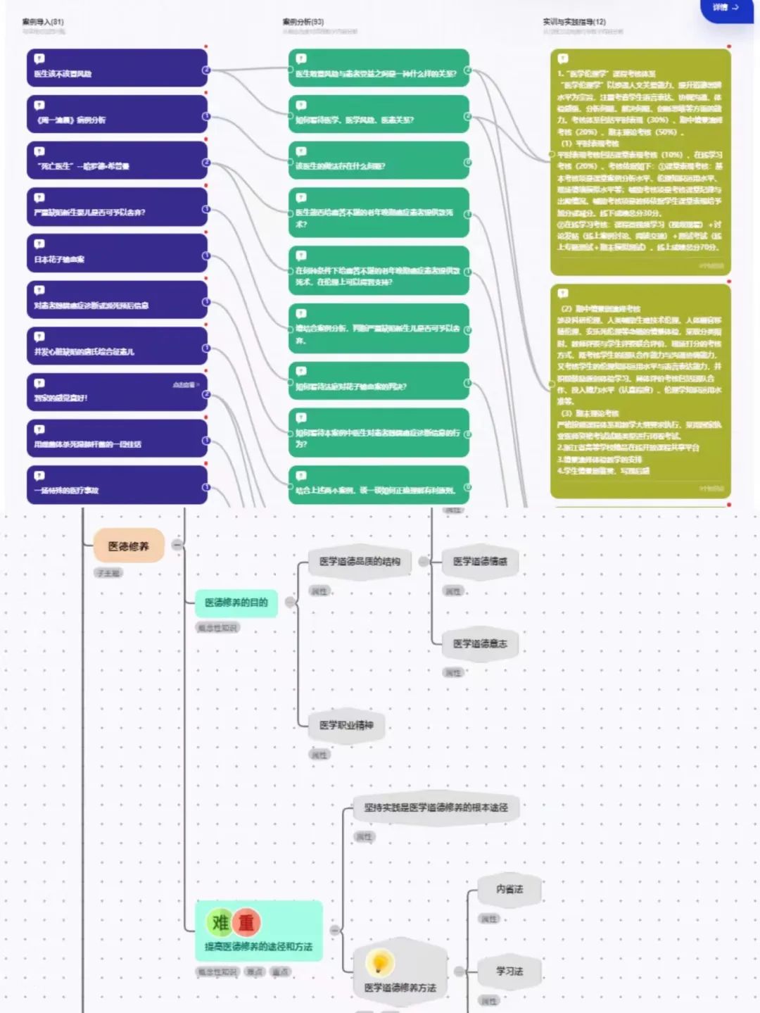 广药大《医学伦理学》作为广东省一流本科课程、广东省课程思政示范课程,在新形态AI课程建设与实践中聚焦课程目标,以教学创新为引导、专业特色为框架,将《医学伦理学》所有的知识点进行碎片化重组,构建出217个问题体系,系统梳理了69个课程思政点、710个知识点,255个情景案例、扩充158个教学资源,975个图谱节点,创新内容呈现方式,具有知识管理、学习导航、学习评估等功能,明确学生在课程中需达成的学习目标层次,增强了学习的目的性,激发学生学习的兴趣,为学生提供基于人工智能的个性化、可视化、多种学习路径推荐,充分体现了对课程教学改革的创新思路。