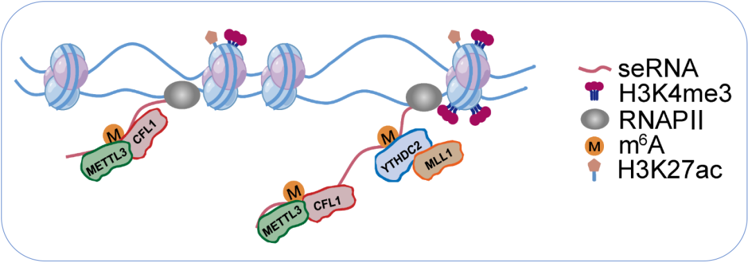超级增强子表达seRNA具有显著的组织和细胞特异性。该研究以胰腺癌为对象,发现胰腺癌细胞的seRNA-m6A含量显著高于正常细胞,其原因是由于胰腺癌细胞高表达m6A甲基转移酶METTL3的协同因子CFL1。高表达的CFL1使seRNA一转录出来就被m6A修饰。m6A-seRNA随后被YTHDC2识别,后者招募组蛋白甲基转移酶MLL1,使邻近染色质区域的组蛋白H3K4三甲基化增加,导致局部染色质开放使癌基因表达上调。