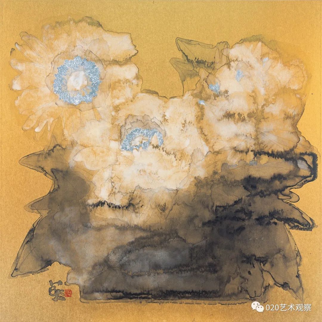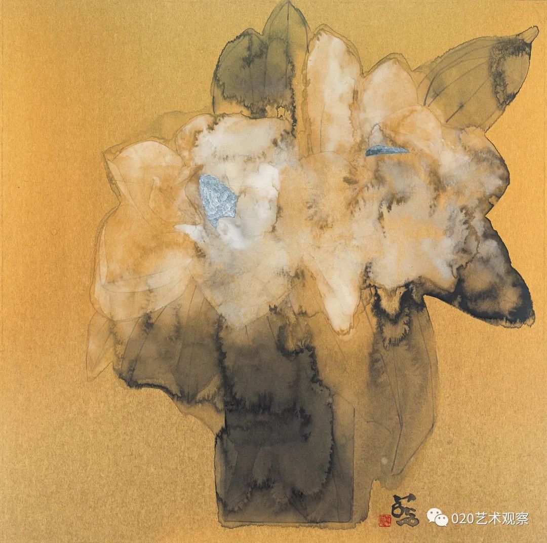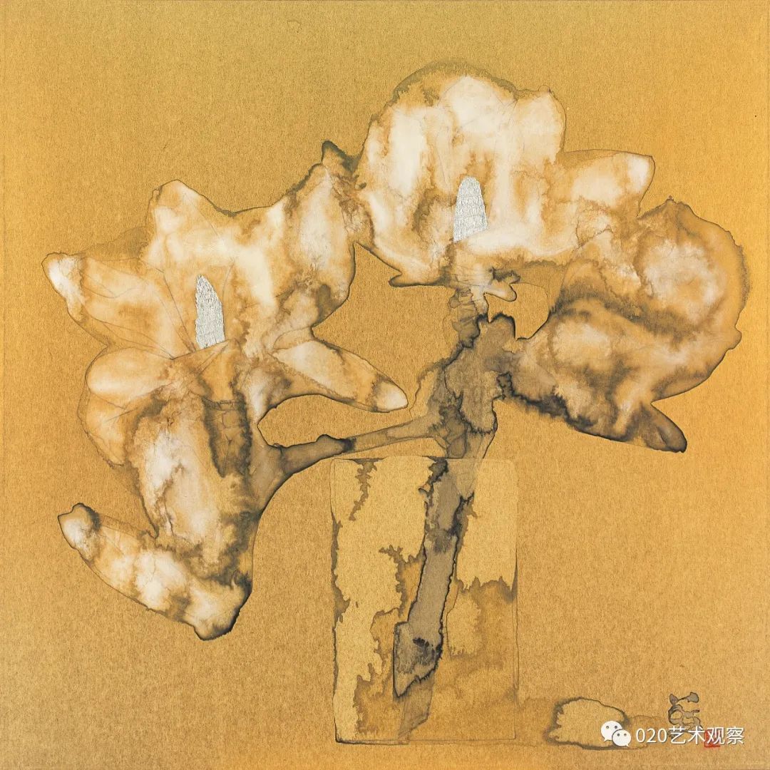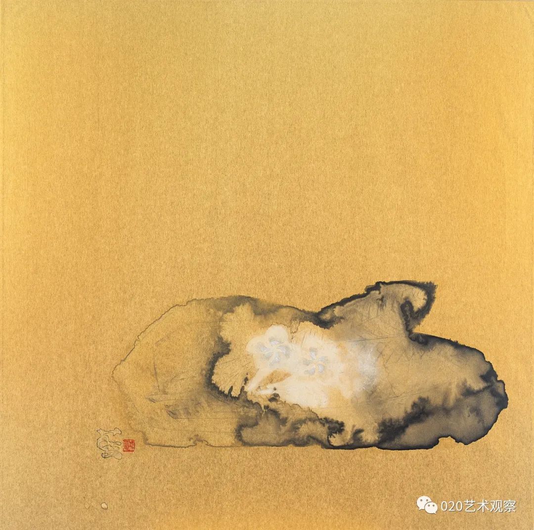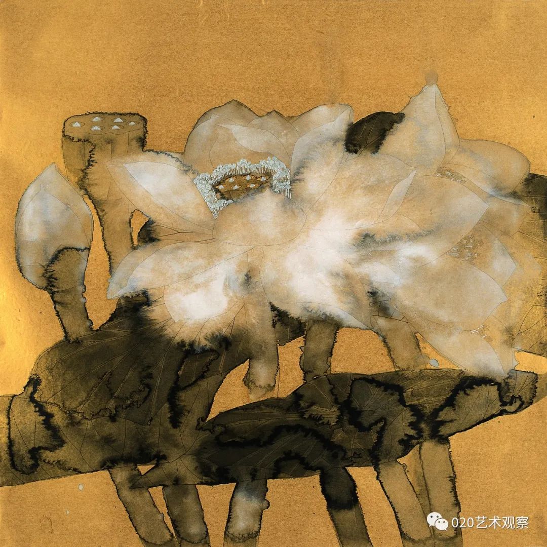 林蓝这批“金色的画”,画得有趣而讲究。她运用金纸色调的衬托,更精炼地突出了墨色和用笔的艺术表现力,既简明又浑厚,含蓄又果断。这批新作很有大胆、朴实而又精到、耐看的特色。正如她自己所总结的,这些画“从起稿的第一笔铅笔线,从笔纸接触的第一点起,到墨、色、粉一层又一层的冲渍痕全部保留在纸面上,把自己所有思想与情绪的流动和起伏都记录下来。一张画记下自己在这个时间段的点点变化,一张张金色的画连接出自己心绪变化的轨迹”。这是一段十分坦诚的表白,也是一种非常好的作画状态,正因为真诚,因而也觉得自然了。虽然是小品,但是很大气。