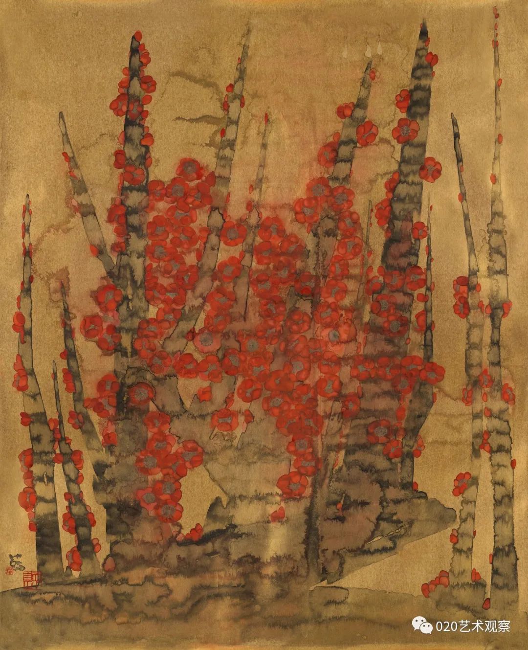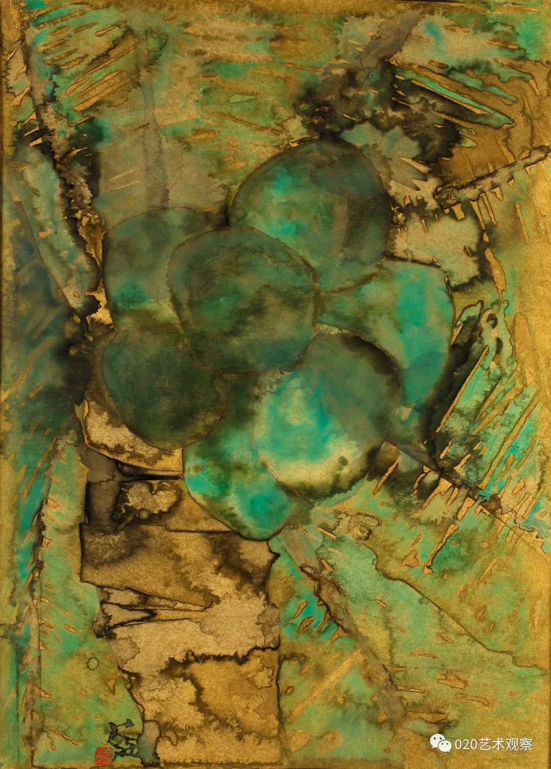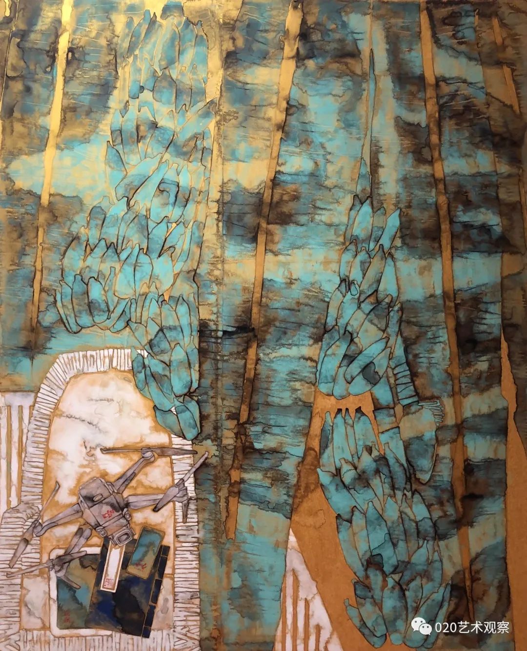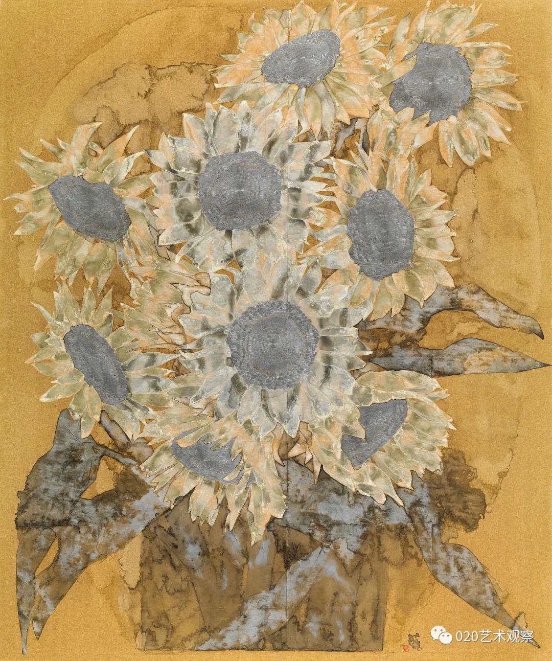 林蓝这批“金色的画”,画得有趣而讲究。她运用金纸色调的衬托,更精炼地突出了墨色和用笔的艺术表现力,既简明又浑厚,含蓄又果断。这批新作很有大胆、朴实而又精到、耐看的特色。正如她自己所总结的,这些画“从起稿的第一笔铅笔线,从笔纸接触的第一点起,到墨、色、粉一层又一层的冲渍痕全部保留在纸面上,把自己所有思想与情绪的流动和起伏都记录下来。一张画记下自己在这个时间段的点点变化,一张张金色的画连接出自己心绪变化的轨迹”。这是一段十分坦诚的表白,也是一种非常好的作画状态,正因为真诚,因而也觉得自然了。虽然是小品,但是很大气。