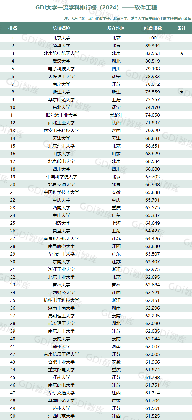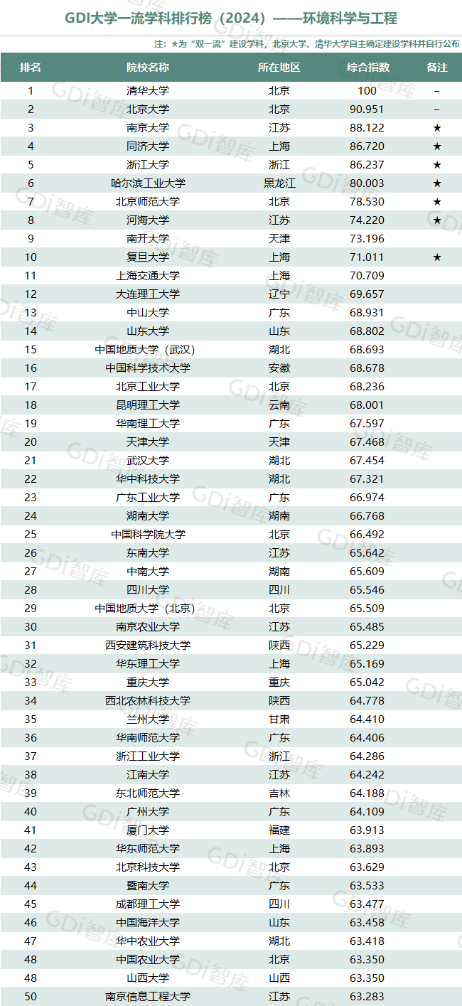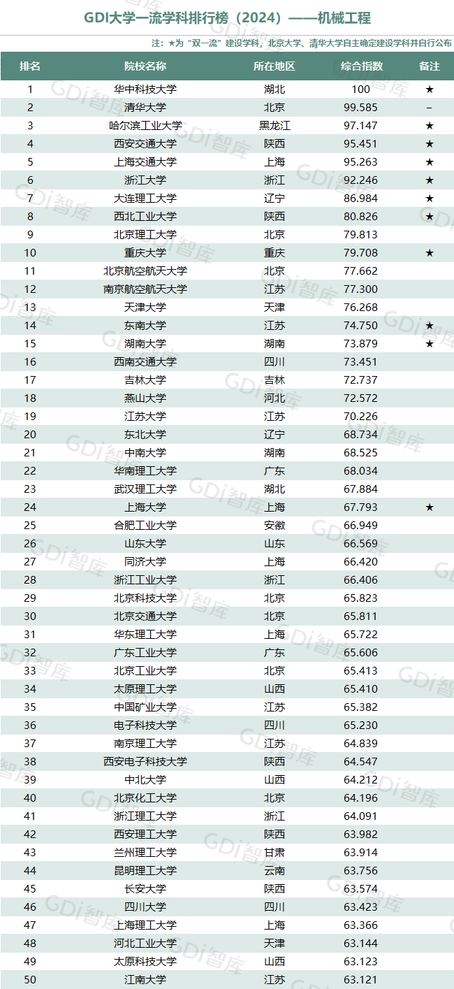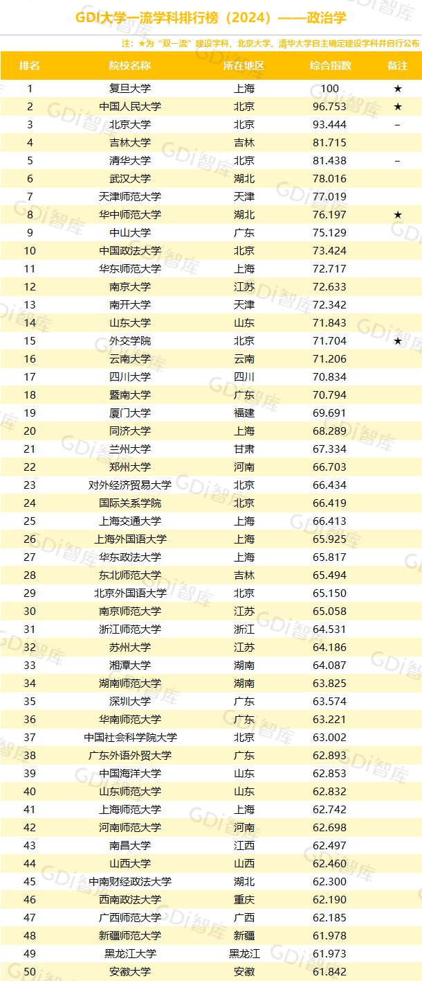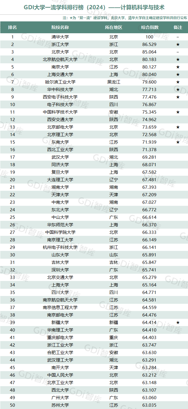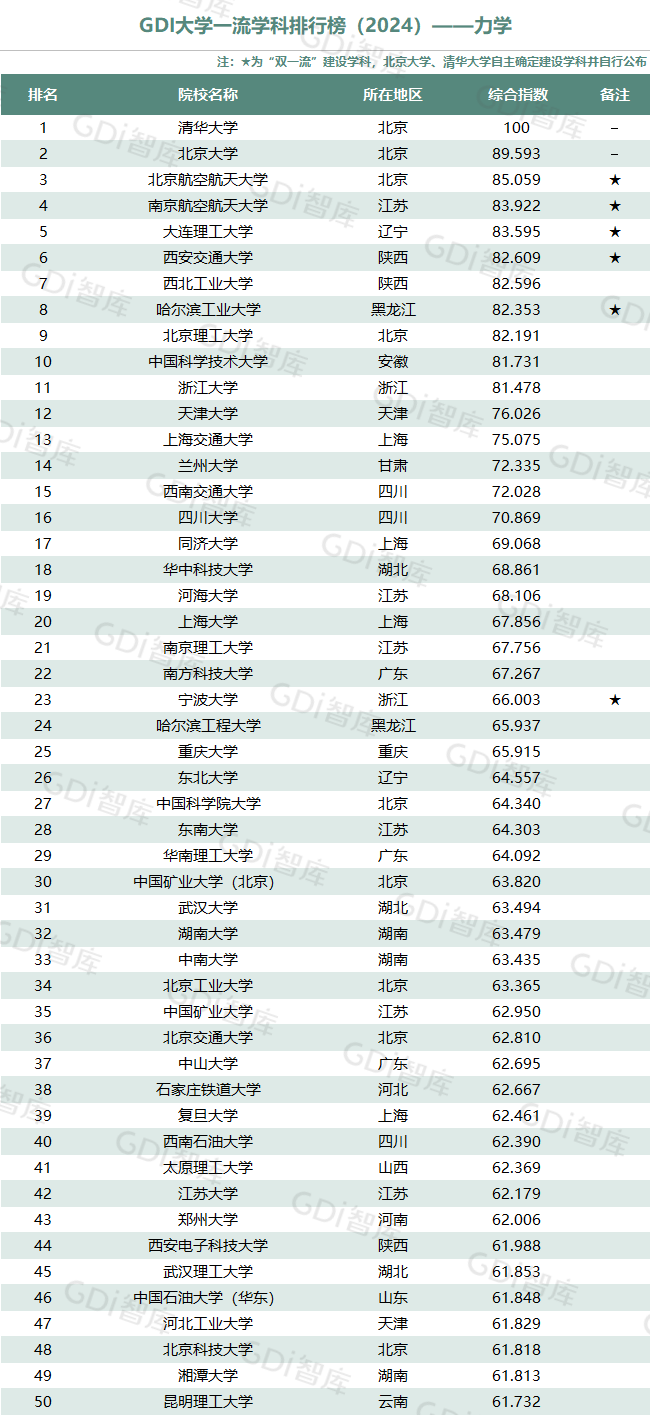 学科是高校承担大学功能的基本载体,是实现高等教育内涵发展的基本支撑,其发展水平在一定程度上决定大学的学术声誉和综合实力。GDI大学一流学科排行榜(2024)对20个人文社会学科、34个自然科学学科和37个工程学科进行评价,涵盖上述学科设有硕士点的全部院校(不含香港特别行政区、澳门特别行政区和台湾地区院校,未涉及军事类院校)。