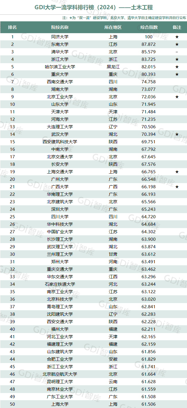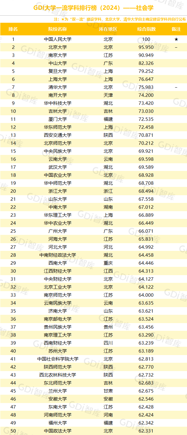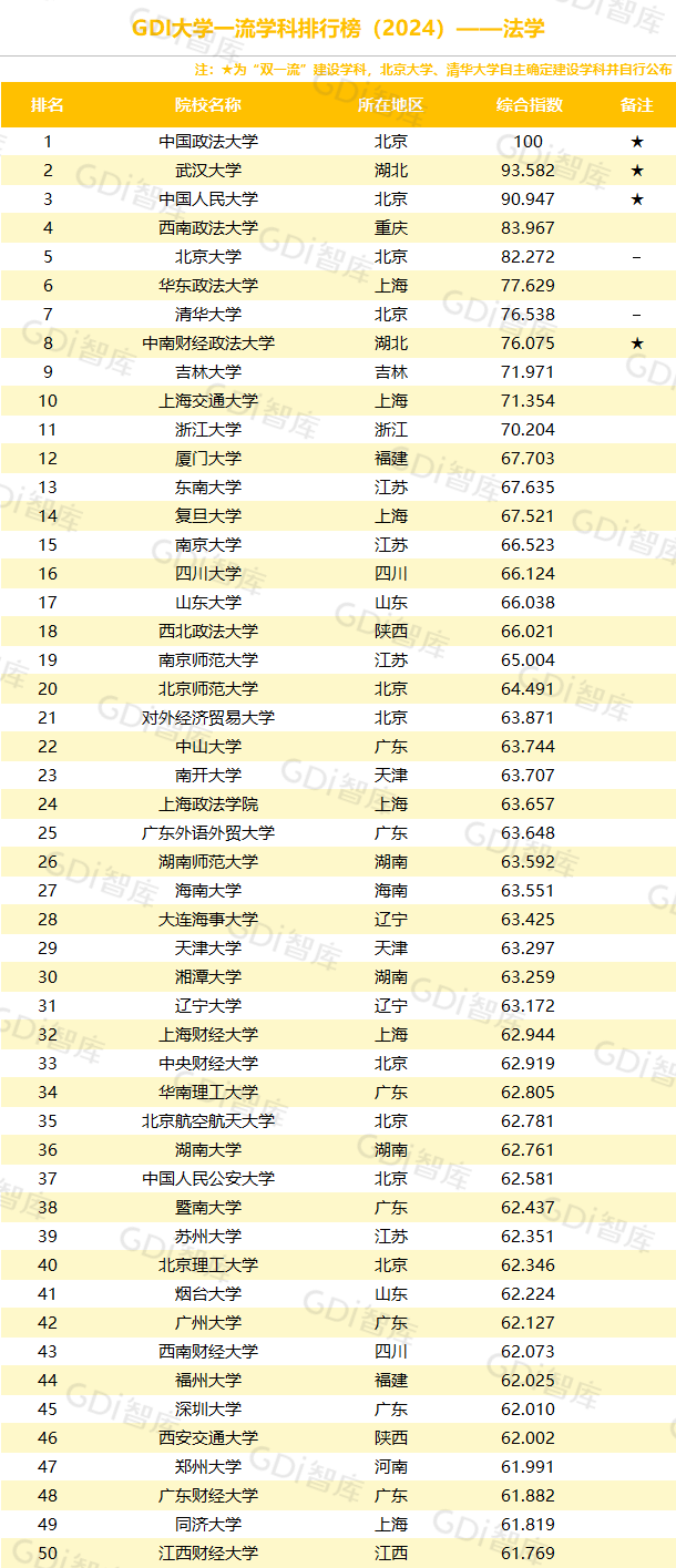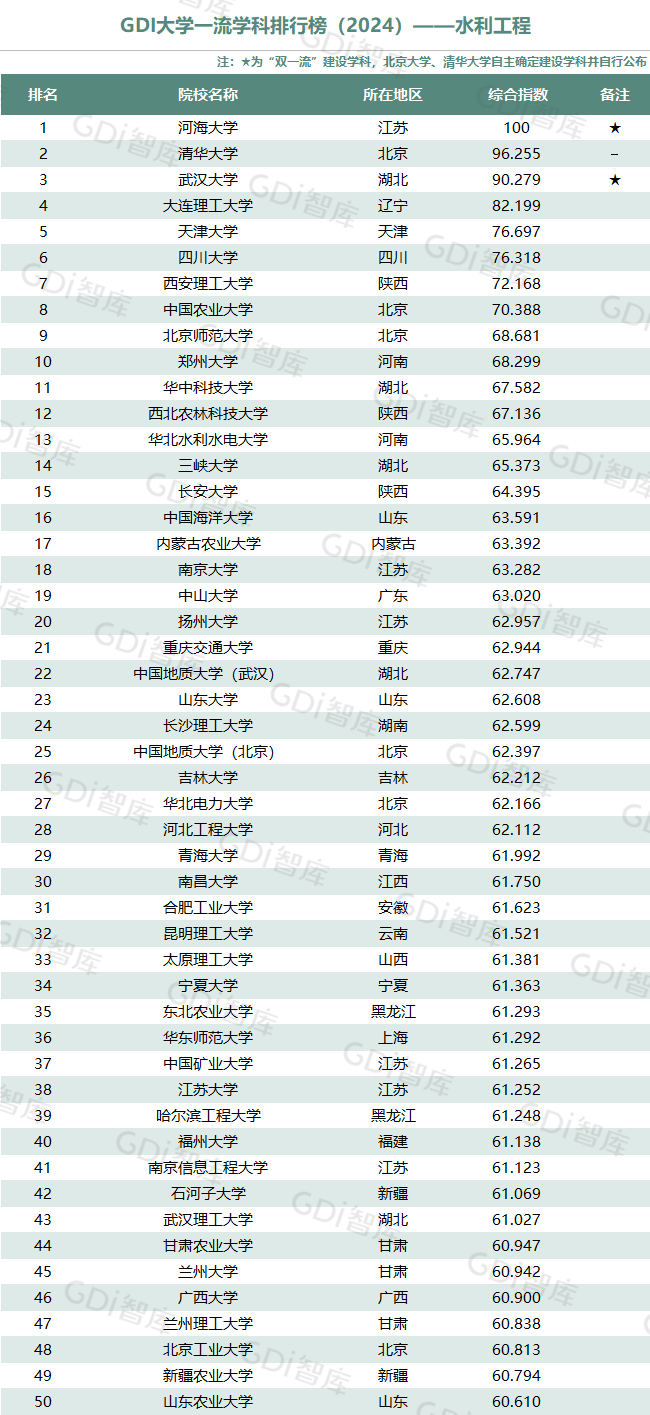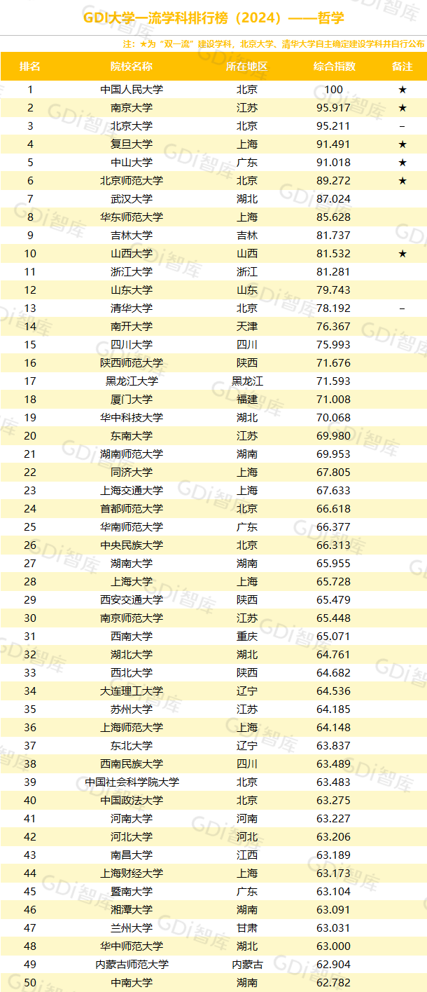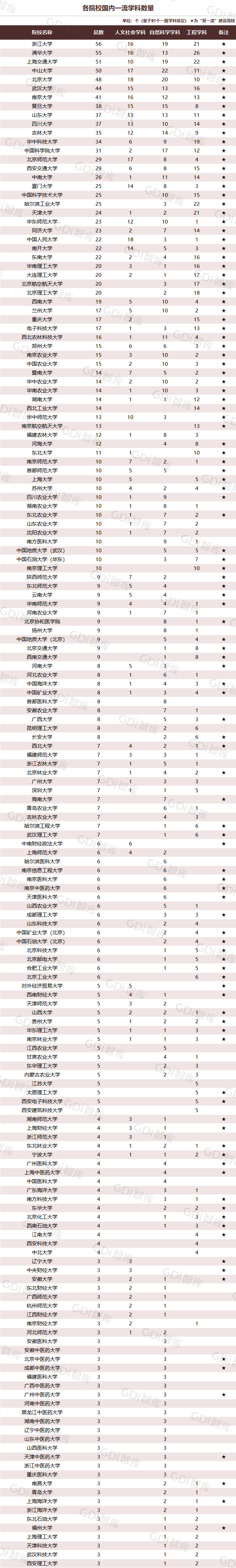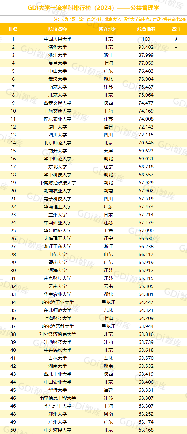 学科是高校承担大学功能的基本载体,是实现高等教育内涵发展的基本支撑,其发展水平在一定程度上决定大学的学术声誉和综合实力。GDI大学一流学科排行榜(2024)对20个人文社会学科、34个自然科学学科和37个工程学科进行评价,涵盖上述学科设有硕士点的全部院校(不含香港特别行政区、澳门特别行政区和台湾地区院校,未涉及军事类院校)。