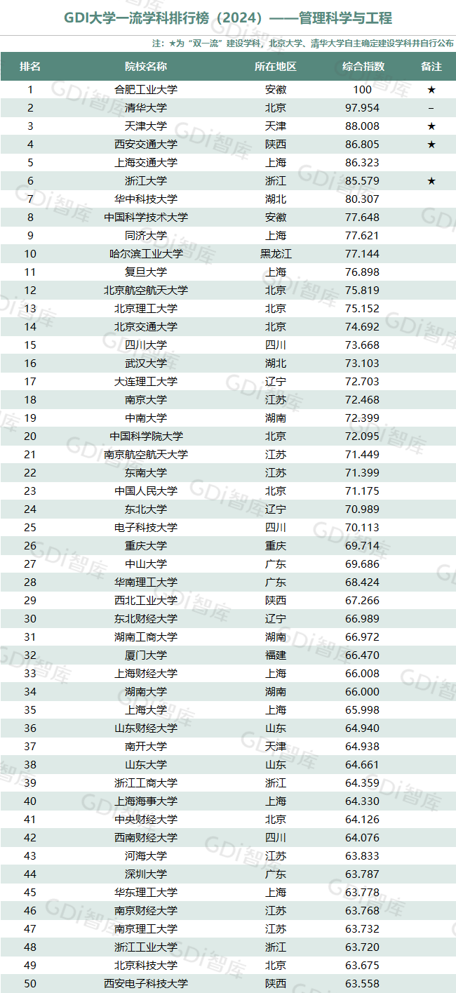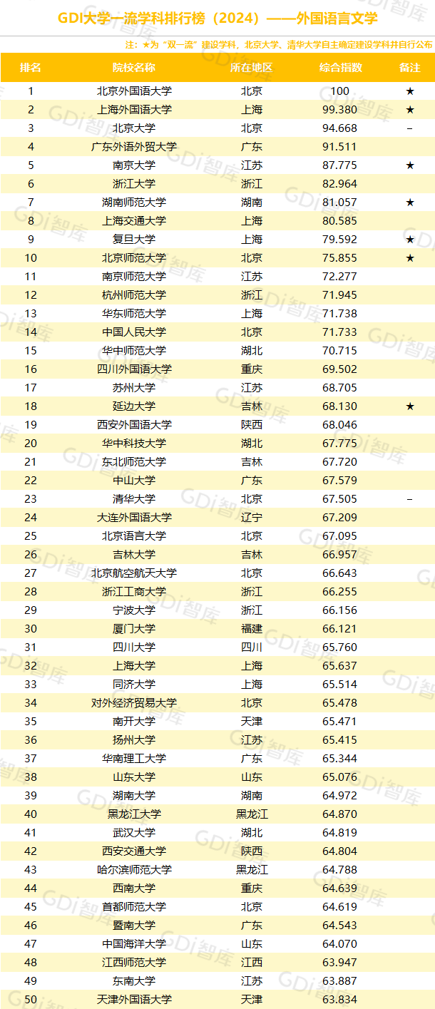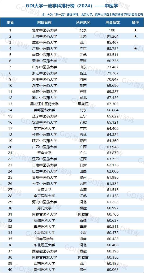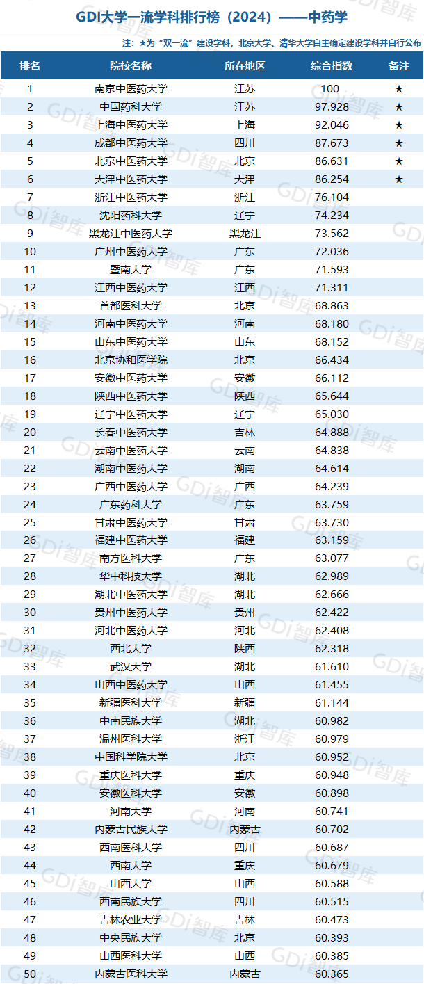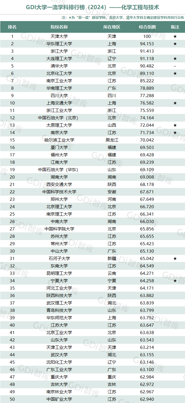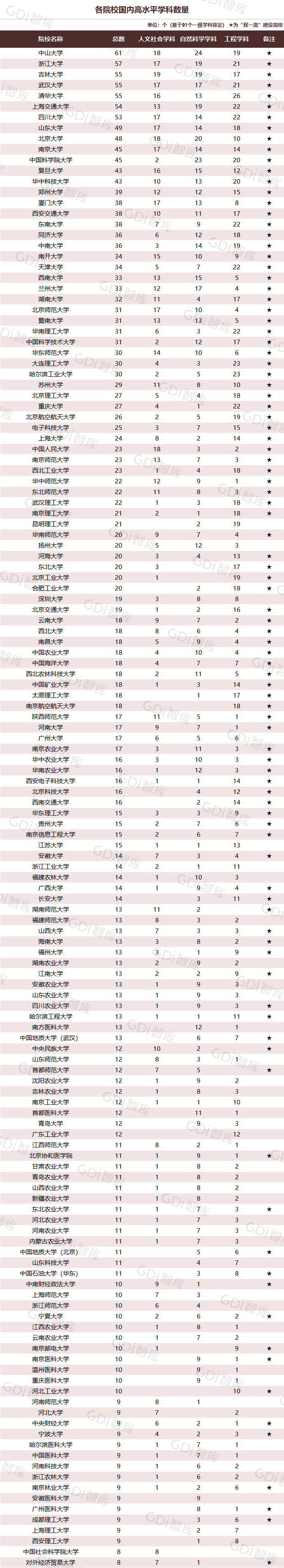 学科是高校承担大学功能的基本载体,是实现高等教育内涵发展的基本支撑,其发展水平在一定程度上决定大学的学术声誉和综合实力。GDI大学一流学科排行榜(2024)对20个人文社会学科、34个自然科学学科和37个工程学科进行评价,涵盖上述学科设有硕士点的全部院校(不含香港特别行政区、澳门特别行政区和台湾地区院校,未涉及军事类院校)。