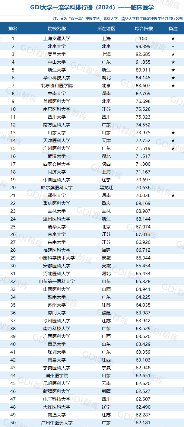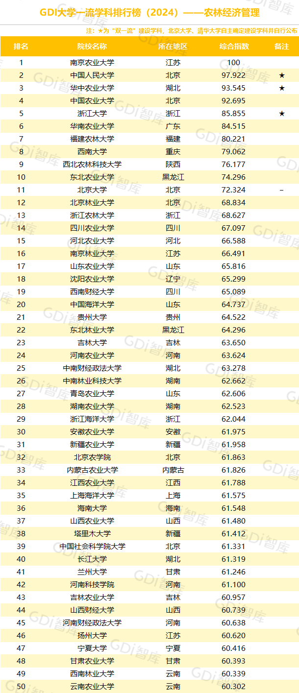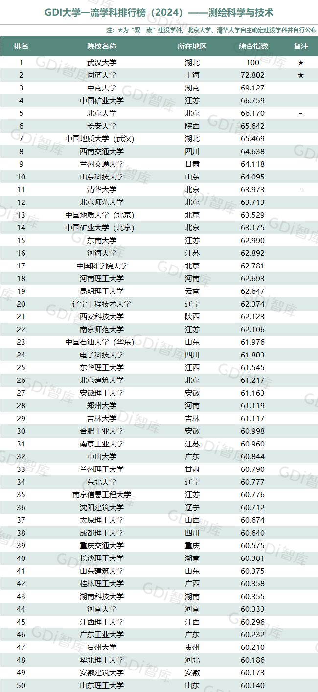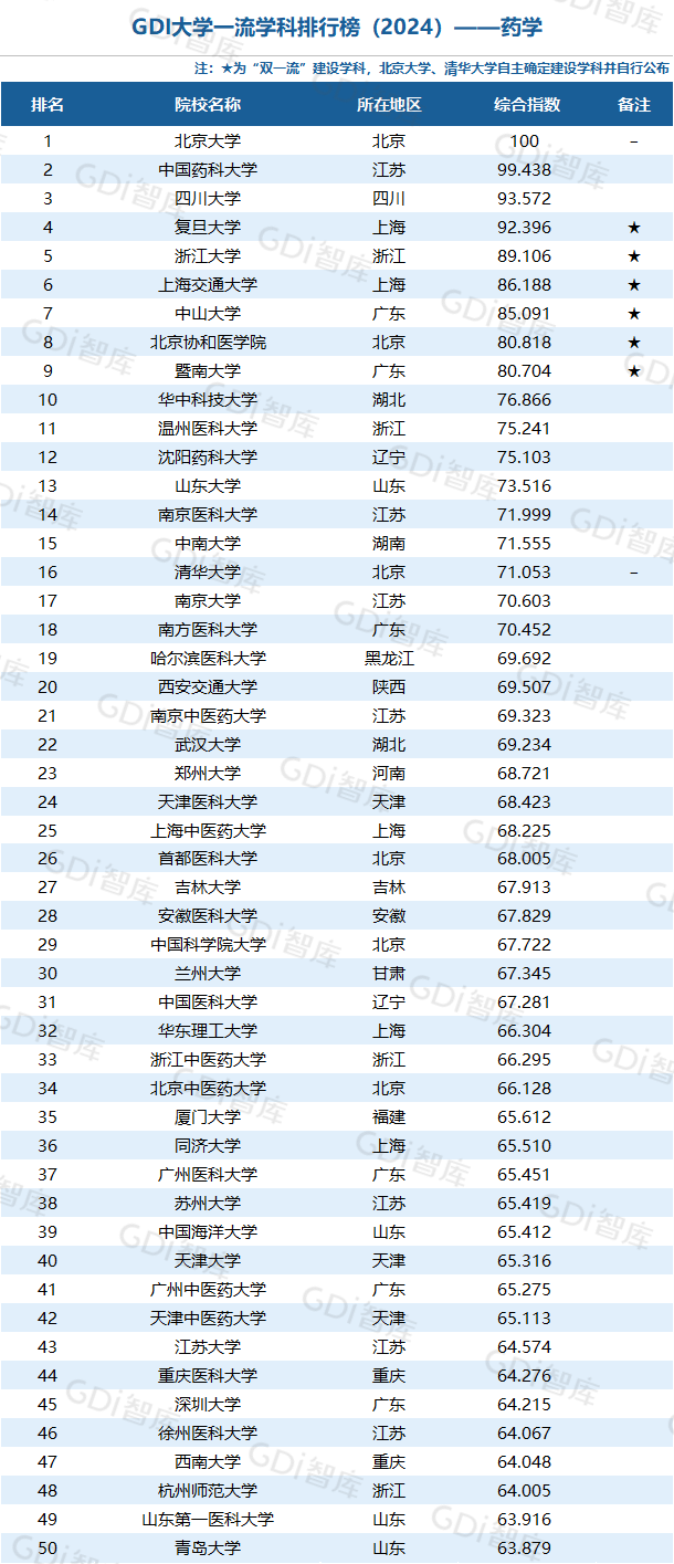 我国高等教育正进入高质量发展新阶段,高校整体办学水平已位于世界前列。GDI大学一流学科排行榜(2024)研制团队认为,一所大学的某个学科排名进入全国前5,表明该大学这一学科的发展水平已跨入“世界一流学科”行列或接近“世界一流学科”水平;进入全国前25表明已进入“国内一流学科”行列;进入全国前50表明已进入“国内高水平学科”行列。