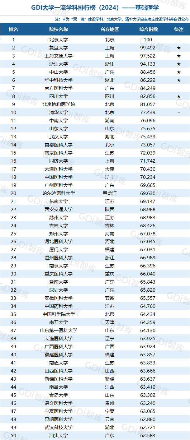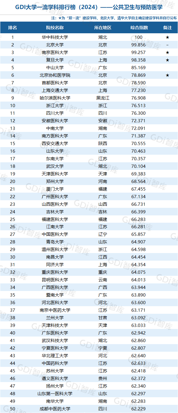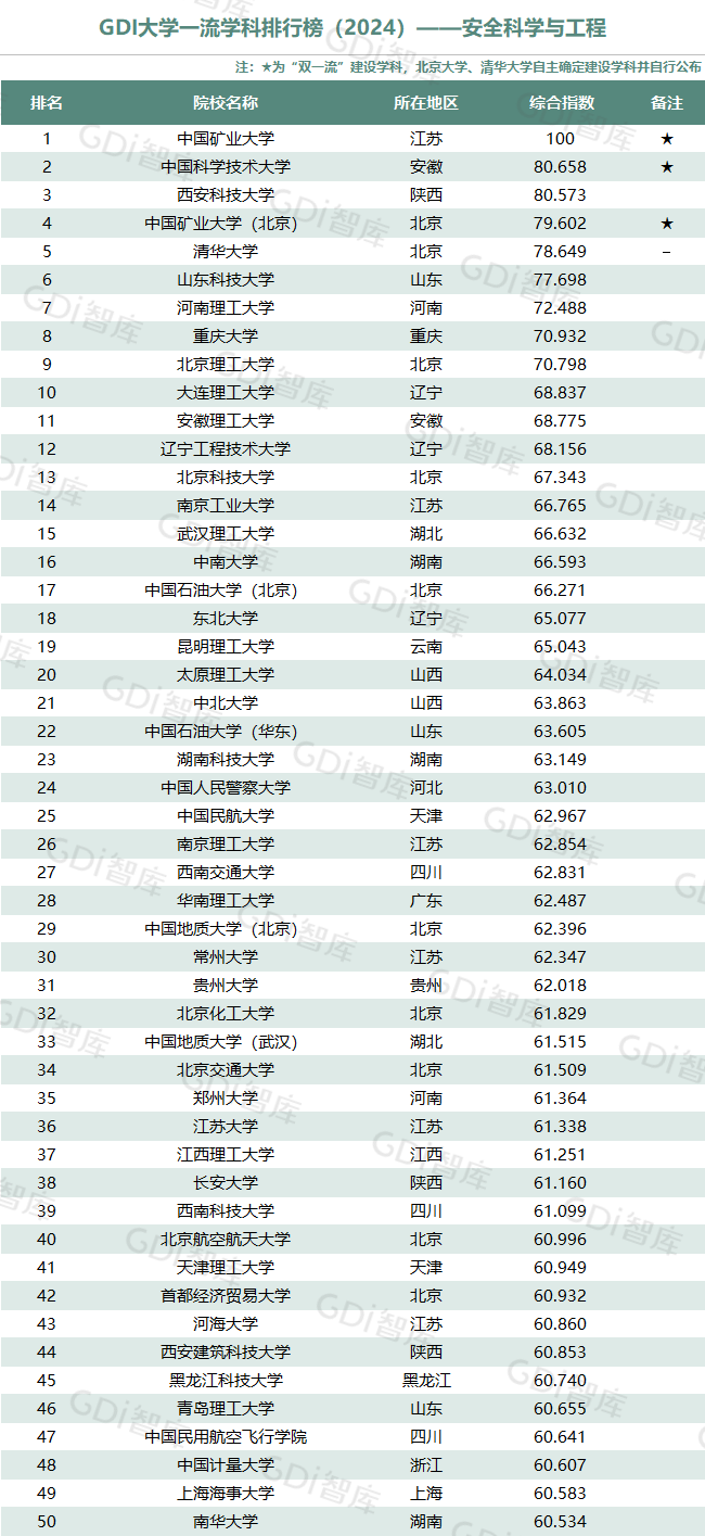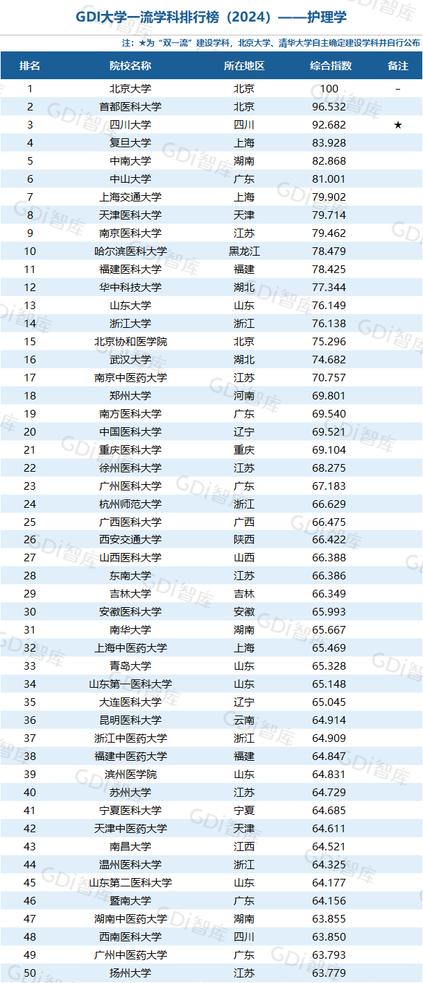 我国高等教育正进入高质量发展新阶段,高校整体办学水平已位于世界前列。GDI大学一流学科排行榜(2024)研制团队认为,一所大学的某个学科排名进入全国前5,表明该大学这一学科的发展水平已跨入“世界一流学科”行列或接近“世界一流学科”水平;进入全国前25表明已进入“国内一流学科”行列;进入全国前50表明已进入“国内高水平学科”行列。