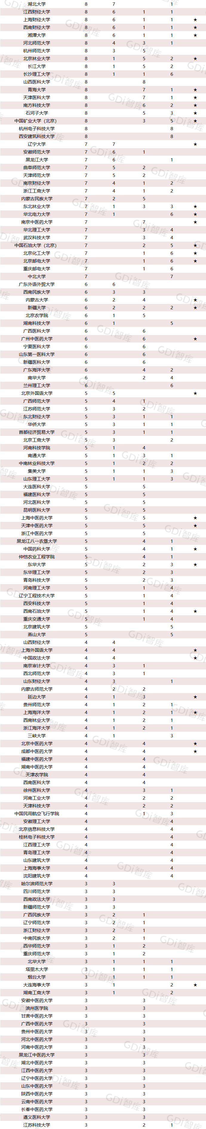 “国内高水平学科”分布在全国432所院校,其中140所为“双一流”建设高校。中山大学有“国内高水平学科”61个,数量位居第一;浙江大学有57个,位居第二;清华大学、武汉大学和吉林大学分别有55个,并列第三。接下来,依次为上海交通大学(54个)、四川大学(53个)、山东大学(49个)和北京大学(48个)。