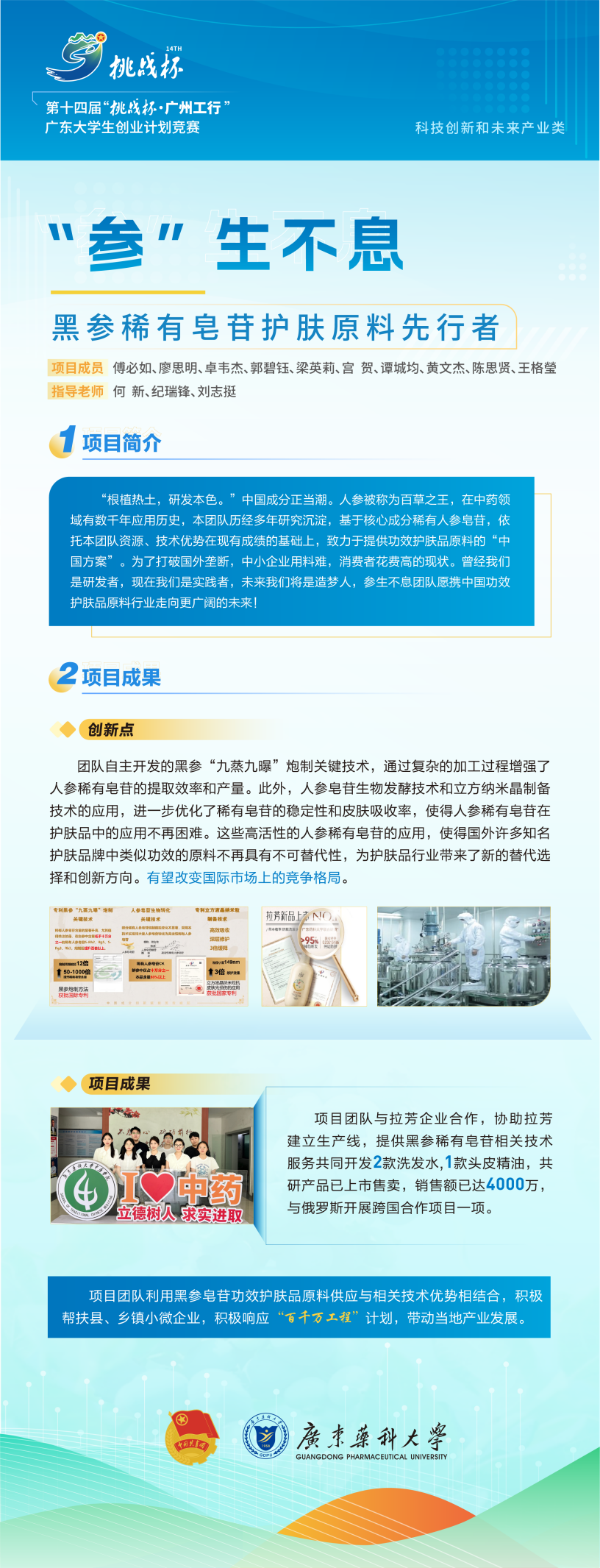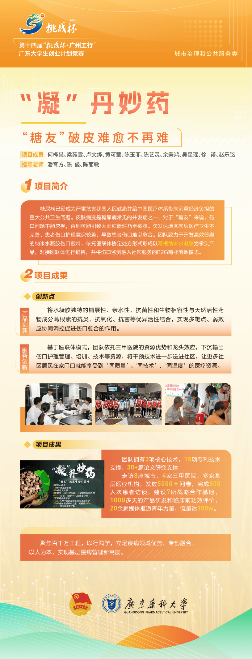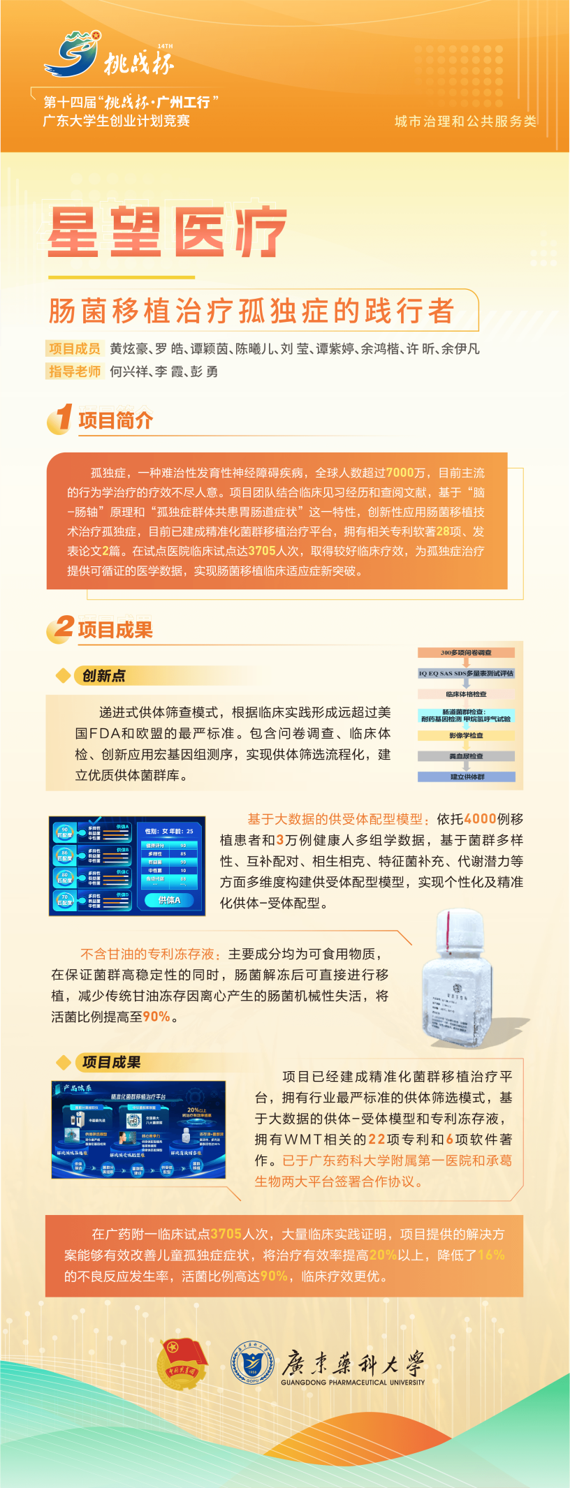 自2023年12月启动校赛以来,广东药科大学多举措并举,各部门齐心协力,鼓励和引导学生参赛,共吸引148项参赛项目,参赛学生累计952人。经过院赛、校赛复赛、决赛角逐,我校最终推报14个项目进入省赛,8个项目入围终审决赛。