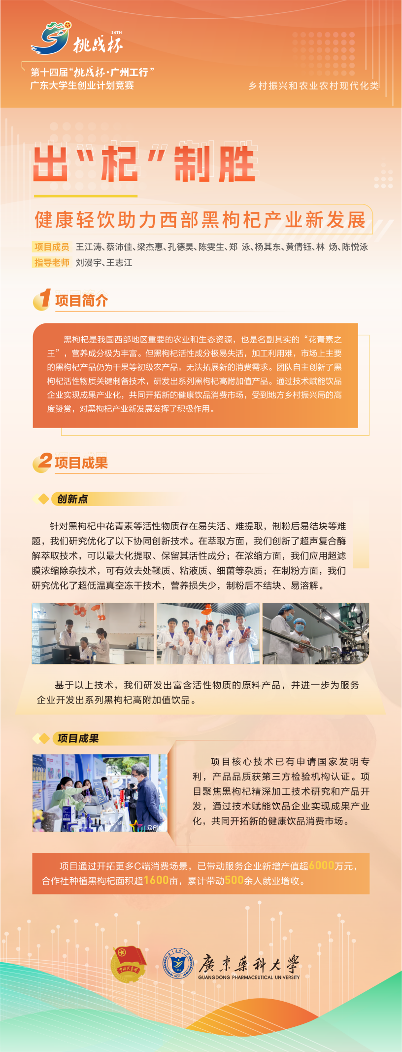 本次“挑战杯”自启动以来,共有157所高校,3.4万件作品参赛,参赛人数超过10万人。经过5个多月的层层评审竞逐,来自全省124所高校的524件参赛作品在终审决赛的舞台上再一次pk。我校8个项目进入终审决赛,最终《萃源——同源优势益生菌技术赋能果蔬高值化加工引领者》《出“杞”制胜——健康轻饮助力西部黑枸杞产业新发展》两个作品喜获乡村振兴和农业农村现代化类金奖。