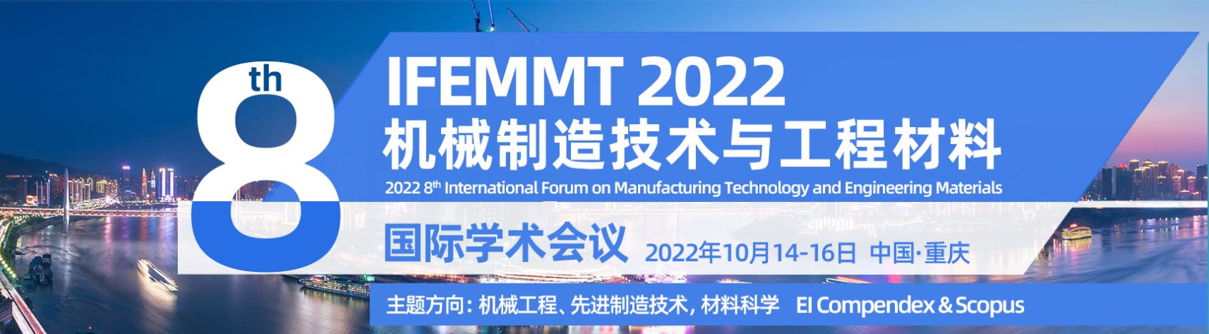 第八届机械制造技术与工程材料国际学术会议(IFEMMT 2022)将于2022年10月14-16日在中国重庆召开。会议致力于为机械工程,材料科学及工业自动化等相关领域的学者,工程师和从业人员提供一个分享最新研究成果的平台。会议征稿主题主要包括但不限于: 机械工程、先进制造技术、材料科学以及自动化技术。IFEMMT2022欢迎各位专家学者投稿参会!